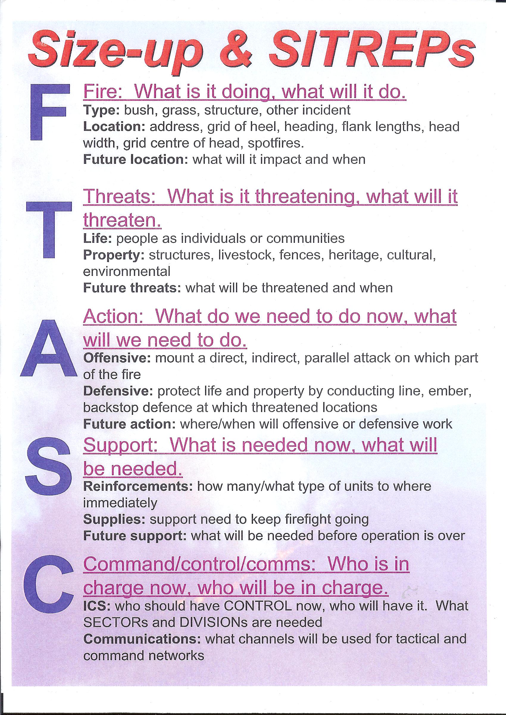 | Code of Conduct for Out of Area | Size-up & Sitrep (FTASC) proceedure |